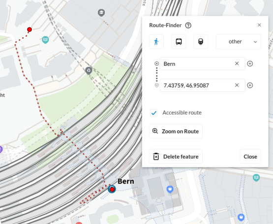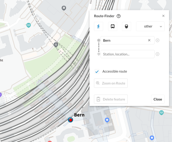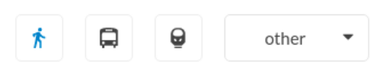 • Wenn das Route-Finder-Popup geöffnet wird, wählen Sie zuerst ein Verkehrsmittel aus. Die Haupt-Verkehrsmittel (Fuss, Zug, Bus) verfügen über spezielle Tasten, während mehrere andere Verkehrsmittel aus einem Dropdown-Menü ausgewählt werden können. Durch das Umschalten zwischen Verkehrsmitteln wird jeweils die aktuelle Route gelöscht und eine neue gestartet.