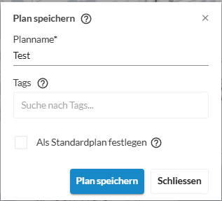 Um Pläne einfach zu gruppieren und zu sortieren, können beim Speichern Tags vergeben werden. Tags können im Speicherdialog ausgewählt oder neu erstellt werden.